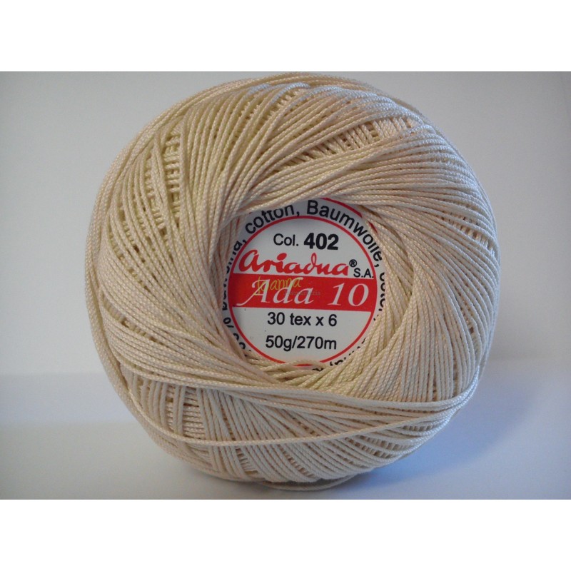 Kordonek Ada 10 - 30 tex x 6 50g/580m. skład 100% bawełna. Producent Ariadna. Techniki: koronka frywolitka, szydełko, siatka Fille, makrama ( Ada 5 ), koronka klockowa.