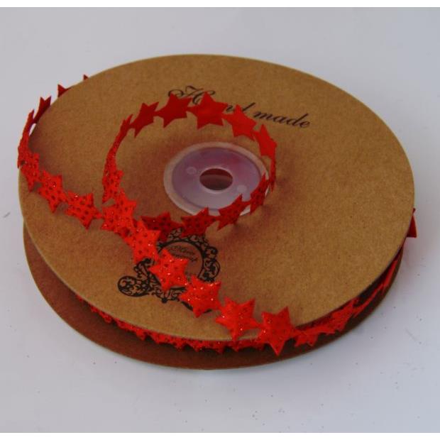 Tasiemka ozdobna gwiazdka. CP100183. Kolor czerwony z brokatem. Wielkośc 14mm. Cena za 1 metr.
