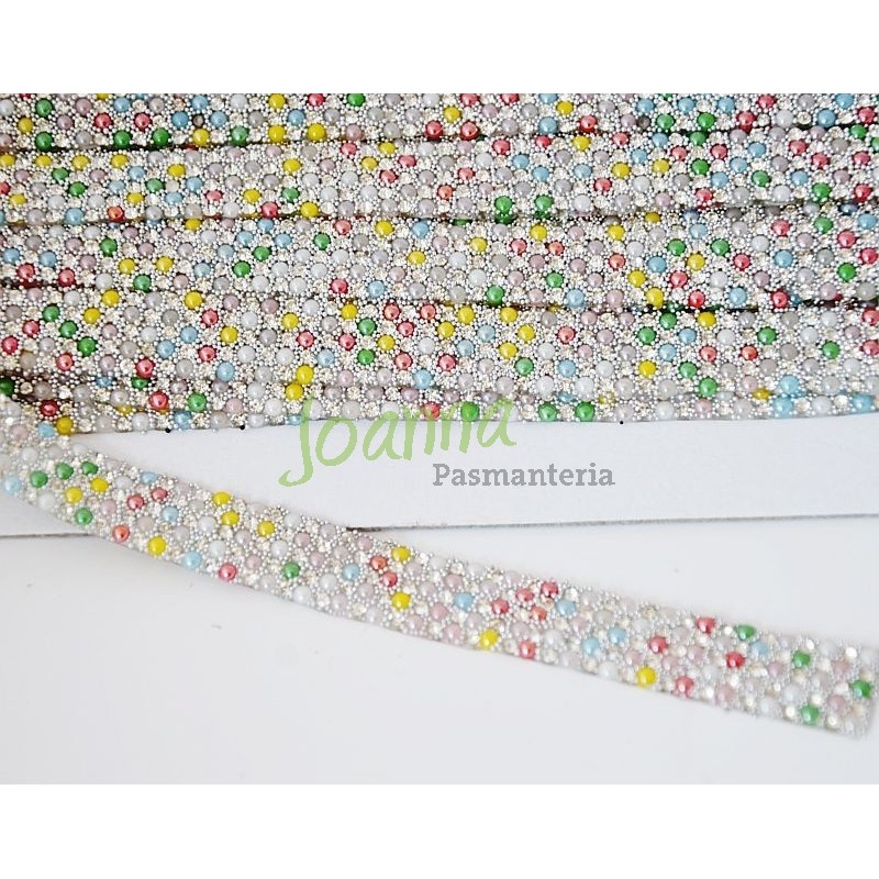 Taśma ozdobna termo-przylepna. CT 658. Kolor srebrny z kolorowymi perełkami. Szerokość 14mm. Cena za 1metr.