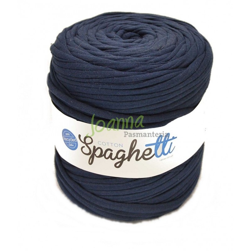 Cotton Spaghetti. Kolor granatowy. Skład: 80% ekobawełny i 20 % inne włókna. 1 motek: około 850 gram / 120 m ( wystarczy na torebkę o wymiarach około 50cm x 50 cm). Ekologiczna łatwa w dziarganiu włóczka. Nici włóczki są bardzo grube dlatego zalecane jest używanie wysokiej numeracji drutów i szydełek . Zalecana do wyrobu pufek, poduszek, torebek, podkładek na stół itd. UWAGA ! W związku z tym, że produkt pochodzi z recyklingu kolory z różnych dostaw mogą się różnić od poprzednich.