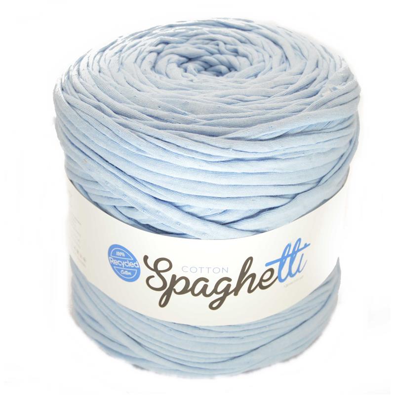 Cotton Spaghetti. Kolor j. niebieski Skład: 80% ekobawełny i 20 % inne włókna. 1 motek: około 850 gram / 120 m ( wystarczy na torebkę o wymiarach około 50cm x 50 cm). Ekologiczna łatwa w dziarganiu włóczka. Nici włóczki są bardzo grube dlatego zalecane jest używanie wysokiej numeracji drutów i szydełek . Zalecana do wyrobu pufek, poduszek, torebek, podkładek na stół itd.