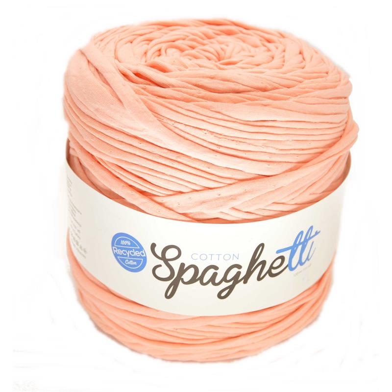 Cotton Spaghetti. Kolor brzoskwinia Skład: 80% ekobawełny i 20 % inne włókna. 1 motek: około 850 gram / 120 m ( wystarczy na torebkę o wymiarach około 50cm x 50 cm). Ekologiczna łatwa w dziarganiu włóczka. Nici włóczki są bardzo grube dlatego zalecane jest używanie wysokiej numeracji drutów i szydełek . Zalecana do wyrobu pufek, poduszek, torebek, podkładek na stół itd.
