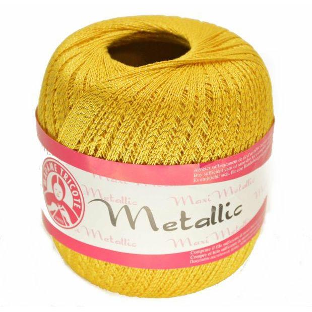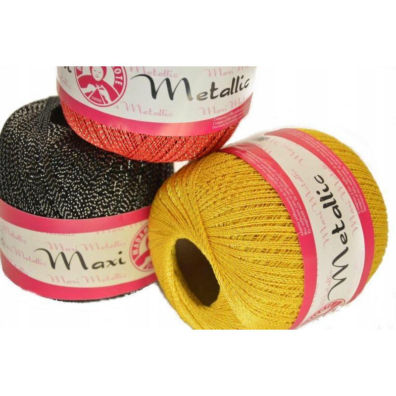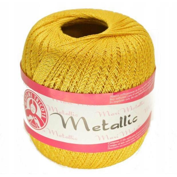 Maxi Metalic. Kordonek bawełniany z metaliczną nitką. 100g/ 540m Kolor żółty ze złotą nitką. Zalecane szydełko 1,5 Zalecane druty 2-2,25. Zalecane do szydełkowania serwetek, ozdób i odzieży. Cena za 1 motek.