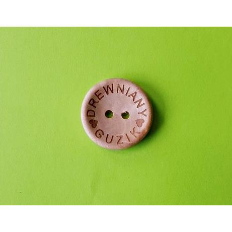 Guzik drewniany. Napis "Drewniany guzik " Kolor naturalny. Wielkość 25mm/25mm. Cena za 1 sztukę.