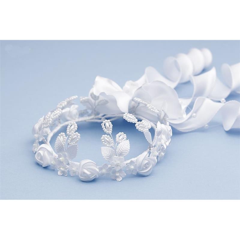 Koczek komunijny W-12. Białe różyczki i kwiatki przeplatane ozdobnymi perełkami. Z tyłu satynowa lokowana kokarda . Wykonany z wysokiej jakości materiału. Produkt Poski. Rozmiar uniwersalny.