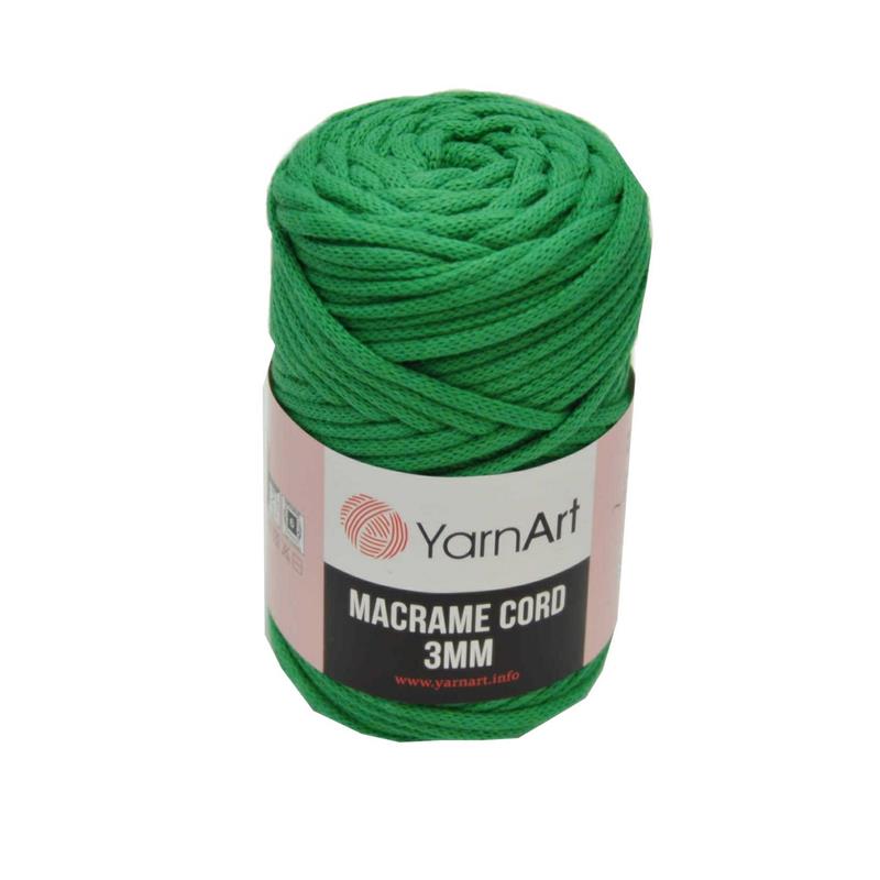 Sznurek Macrame CORD 3mm. Yarn Art. Kolor 759 zielony Skład: 60% Cotton 40% Viscoze i Poliester. 250g/85metrów. Zalecane druty 7mm. Zalecane szydełko 8mm. Sznurek stosuje się do zaplatania makramy a także do dziergania torebek, koszyków, podkładek i dywaników.