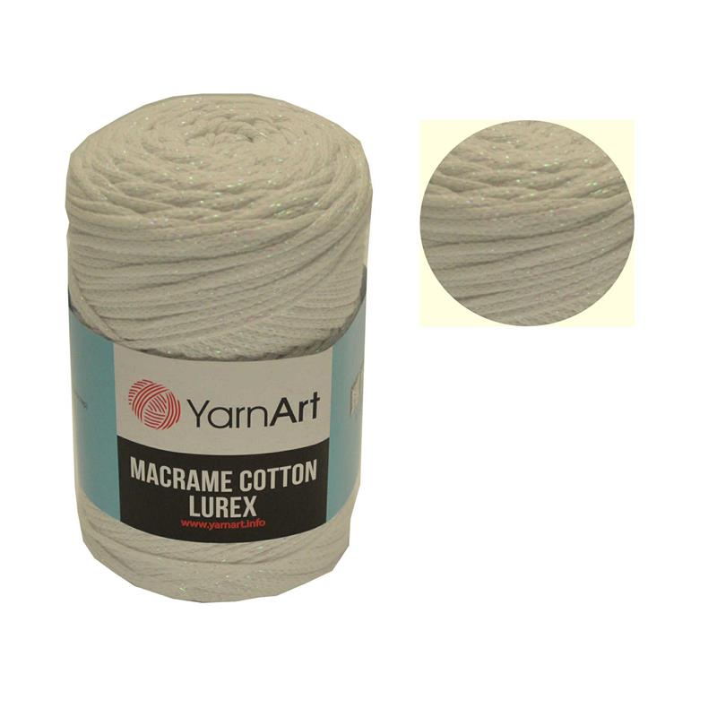 Włóczka Macrame Cotton Lurex YarnArt. Skład: 75% Bawełna 13% Poliester 12% Metalic Kolor biały z opalizującą nitką 721 . Włóczka-sznurek szerokość 3mm. 250g/205m. Turecki sznurek używany do zaplatania techniką makrama ,a także do szydełkowania. Cena za 1 motek. Zalecane druty 5mm, Zalecane szydełko 5mm.