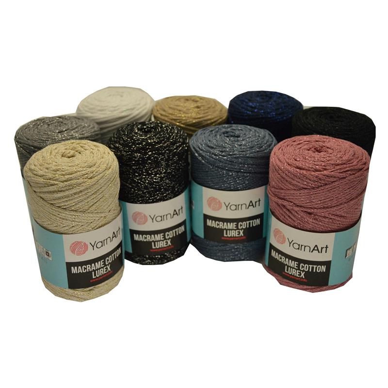 Włóczka Macrame Cotton Lurex YarnArt. Skład: 75% Bawełna 13% Poliester 12% Metalic . Kolor ecri ze złotą nitką 740 . Włóczka-sznurek szerokość 3mm. 250g/205m. Turecki sznurek używany do zaplatania techniką makrama ,a także do szydełkowania. Cena za 1 motek. Zalecane druty 5mm, Zalecane szydełko 5mm.