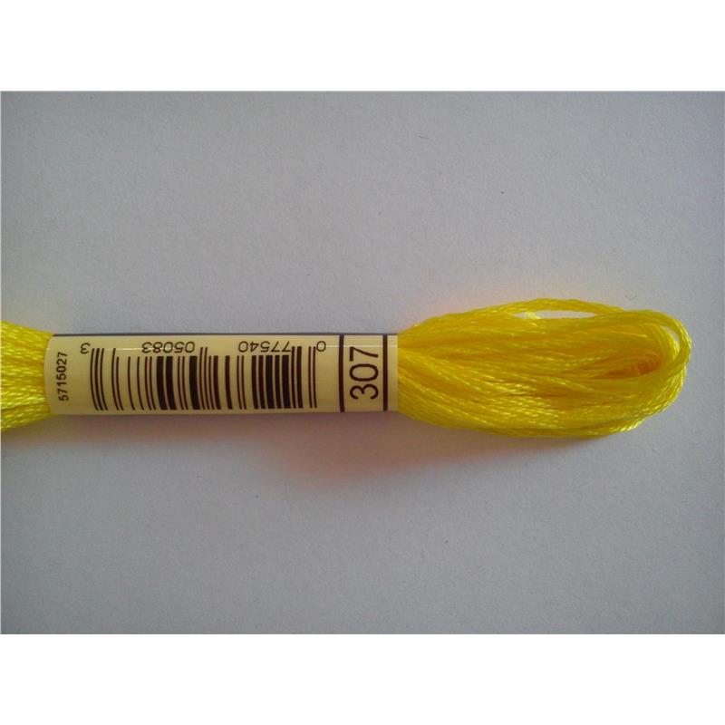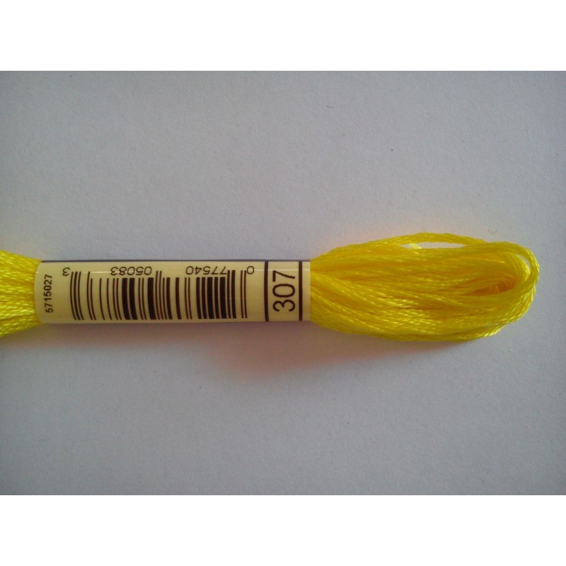 Mulina DMC kolor 307 - pasemko bawełniane 8m/8yd, dzieli się na 6 nitek. Najwyższej jakości podwójnie merceryzowana bawełna długowłóknista nadaje tej nici wyjątkowego połysku. Technika: haft krzyzykowy, haft półkrzyżykowy, haft płaski, igłą malowane.