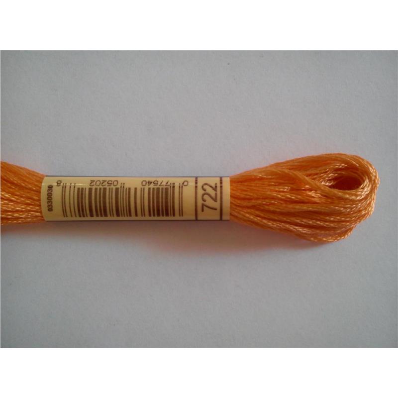 Mulina DMC kolor 722 - pasemko bawełniane 8m/8yd, dzieli się na 6 nitek. Najwyższej jakości podwójnie merceryzowana bawełna długowłóknista nadaje tej nici wyjątkowego połysku. Technika: haft krzyzykowy, haft półkrzyżykowy, haft płaski, igłą malowane.