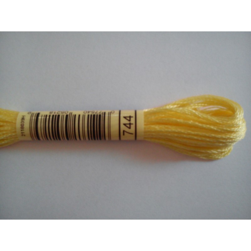 Mulina DMC kolor 744 - pasemko bawełniane 8m/8yd, dzieli się na 6 nitek. Najwyższej jakości podwójnie merceryzowana bawełna długowłóknista nadaje tej nici wyjątkowego połysku. Technika: haft krzyzykowy, haft półkrzyżykowy, haft płaski, igłą malowane.