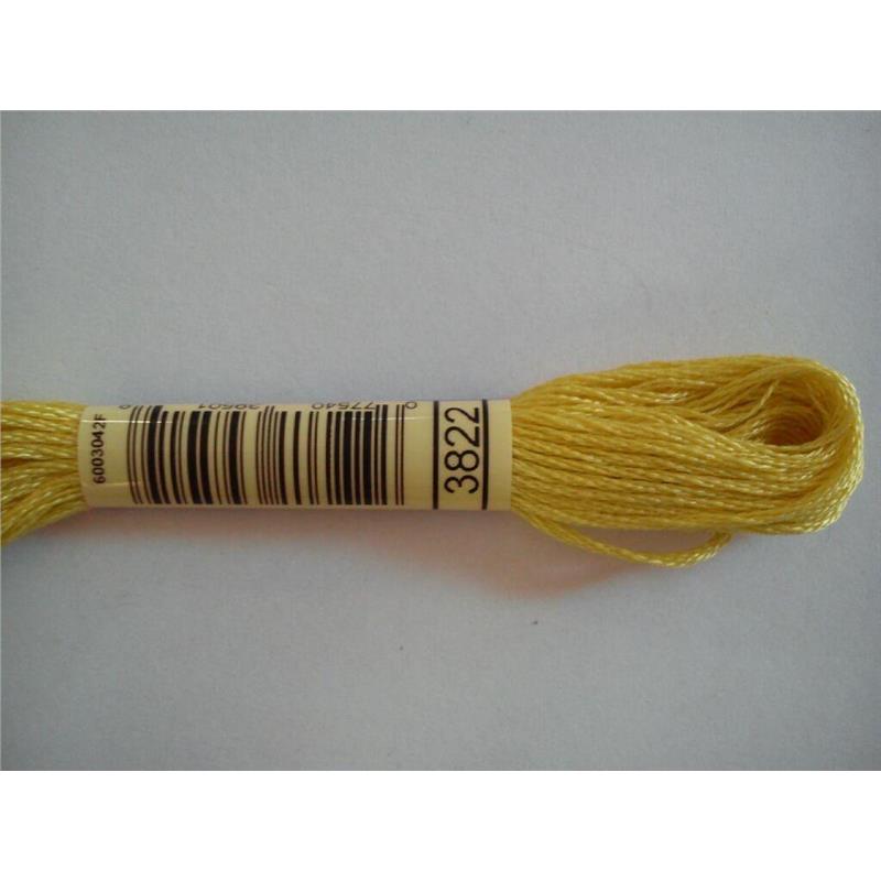 Mulina DMC kolor 3822- pasemko bawełniane 8m/8yd, dzieli się na 6 nitek. Najwyższej jakości podwójnie merceryzowana bawełna długowłóknista nadaje tej nici wyjątkowego połysku. Technika: haft krzyzykowy, haft półkrzyżykowy, haft płaski, igłą malowane.