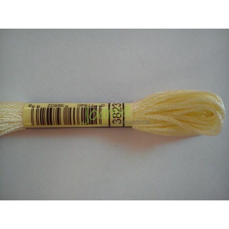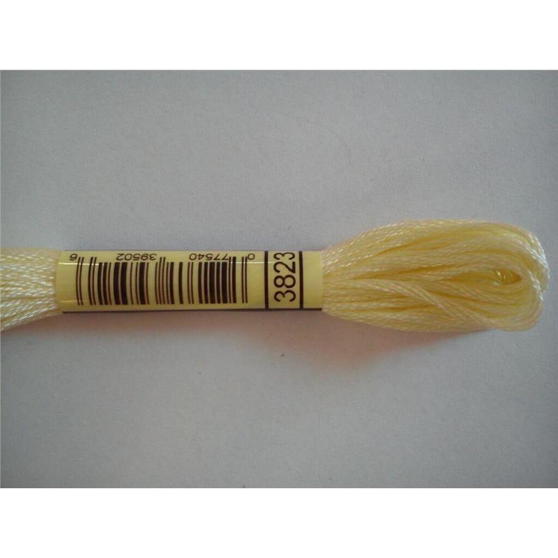 Mulina DMC kolor 3823- pasemko bawełniane 8m/8yd, dzieli się na 6 nitek. Najwyższej jakości podwójnie merceryzowana bawełna długowłóknista nadaje tej nici wyjątkowego połysku. Technika: haft krzyzykowy, haft półkrzyżykowy, haft płaski, igłą malowane.