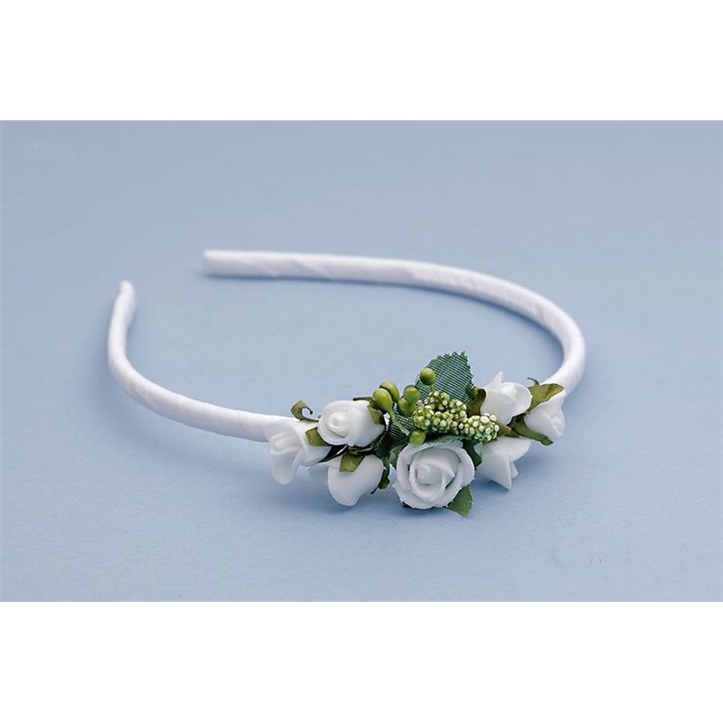 Opaska komunijna 64. Drobne białe różyczki z zielonymi listkami. Produkt polski. rozmiar uniwersalny.