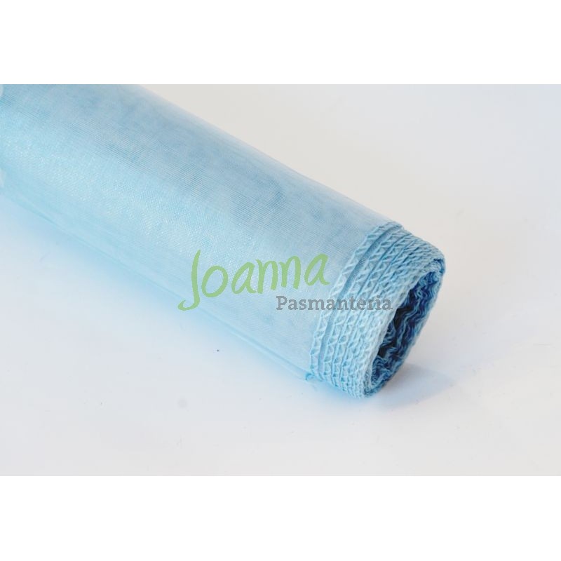 Organza gładka,obszywana. Kolor błękit. Szerokość 0,38cm. Długość 9m. Cena za 1 rolkę.
