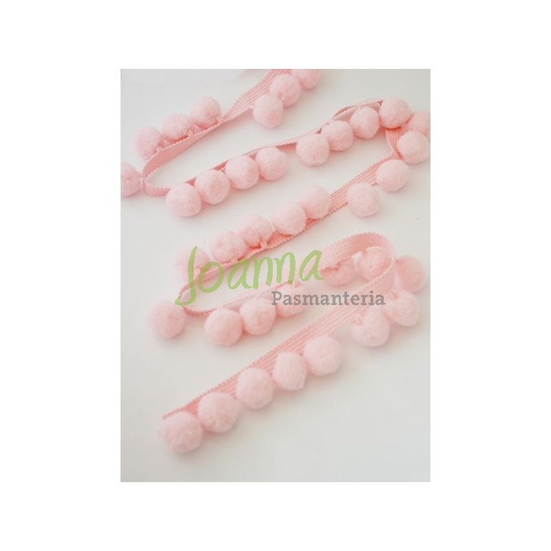 Pompony na taśmie. Kolor jasny różowy. Wielkośc pomponika 25mm. Długośc taśmy z pomponem 38mm. Cena za 1m.