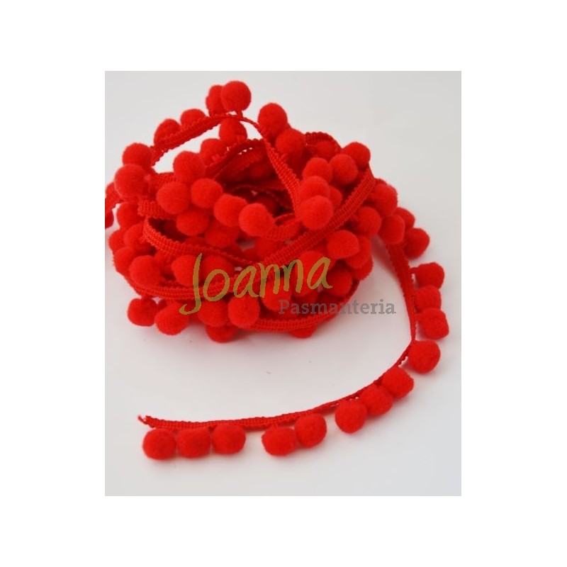Pompony na taśmie. Kolor czerwony. Wielkośc pomponika 10mm. Długośc taśmy z pomponem 15mm. Cena za 1m.