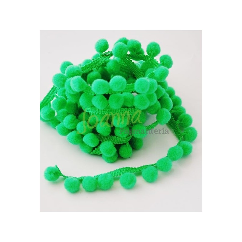 Pompony na taśmie. Kolor zielony. Wielkośc pomponika 10mm. Długośc taśmy z pomponem 15mm. Cena za 1m.