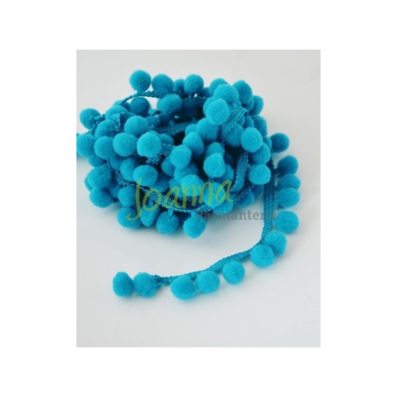 Pompony na taśmie. Kolor turkus. Wielkośc pomponika 10mm. Długośc taśmy z pomponem 15mm. Cena za 1m.