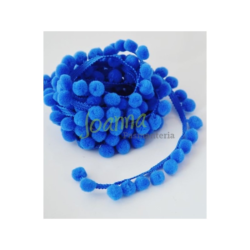 Pompony na taśmie. Kolor chabrowy. Wielkośc pomponika 10mm. Długośc taśmy z pomponem 15mm. Cena za 1m.