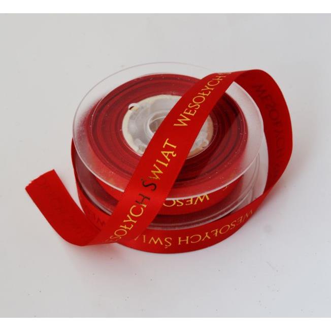 Tasiemka ozdobna CP100188. Atłasowa z nadrukiem Wesołych Świą. Kolor czerwony ze złotym napisem. Szerokość 16mm. Cena za 1 metr.