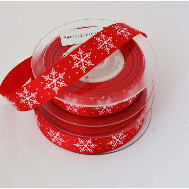 Tasiemka ozdobna CP100160. Atłasowa z nadrukiem śnieżynek. Kolor czerwony z białym nadrukiem. Szerokość 16mm. Cena za 1 metr.