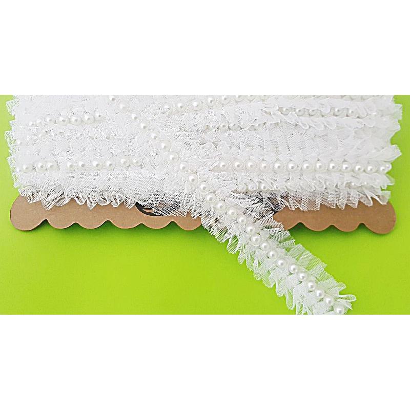 Taśma ozdobna CT 795. Kolor biały. Szerokość 3cm. Tiulowe marszczenie ozdobione perełką. Cena za 1 metr.
