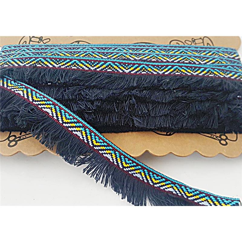 Taśma dekoracyjna 046. Szerokość 3cm. Kolor granat, turkus, żółty, bordo i fiolet. Taśma z fredzlami. Cena za metr,