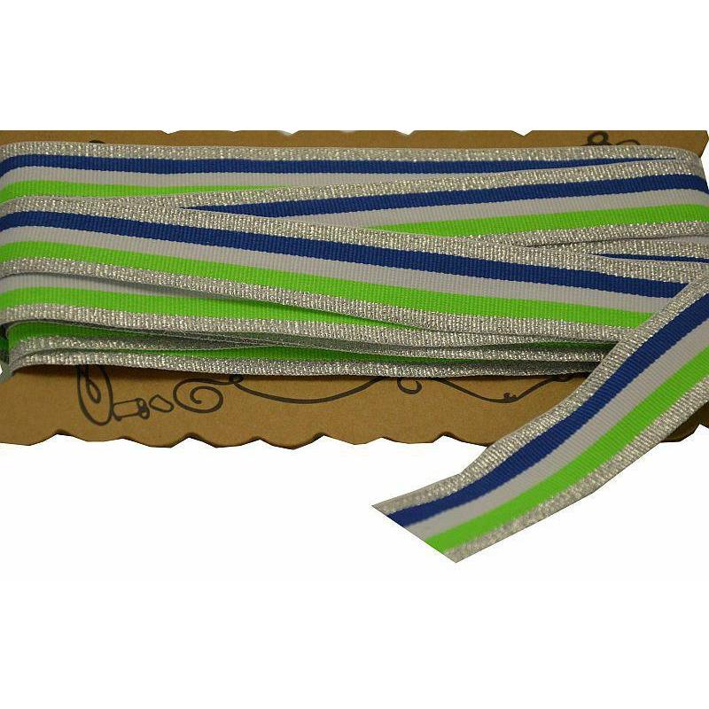 Taśma dekoracyjana lampasowa 082. Szerokość 3cm. Kolor zielono-biało-granatowo-srebrny. Cena za 1 metr. Taśma ozdobna do wszelkiego rodzaju dekoracji a także jako taśma lampasowa do odzieży.