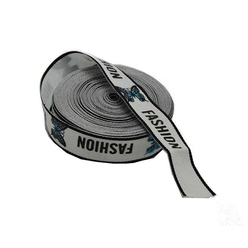 Taśma dekoracyjna 059 Fashion Motyl Szerokość 25mm. Kolor biały z czarnymi napisami i niebieskim motylem. Cena za 1metr.