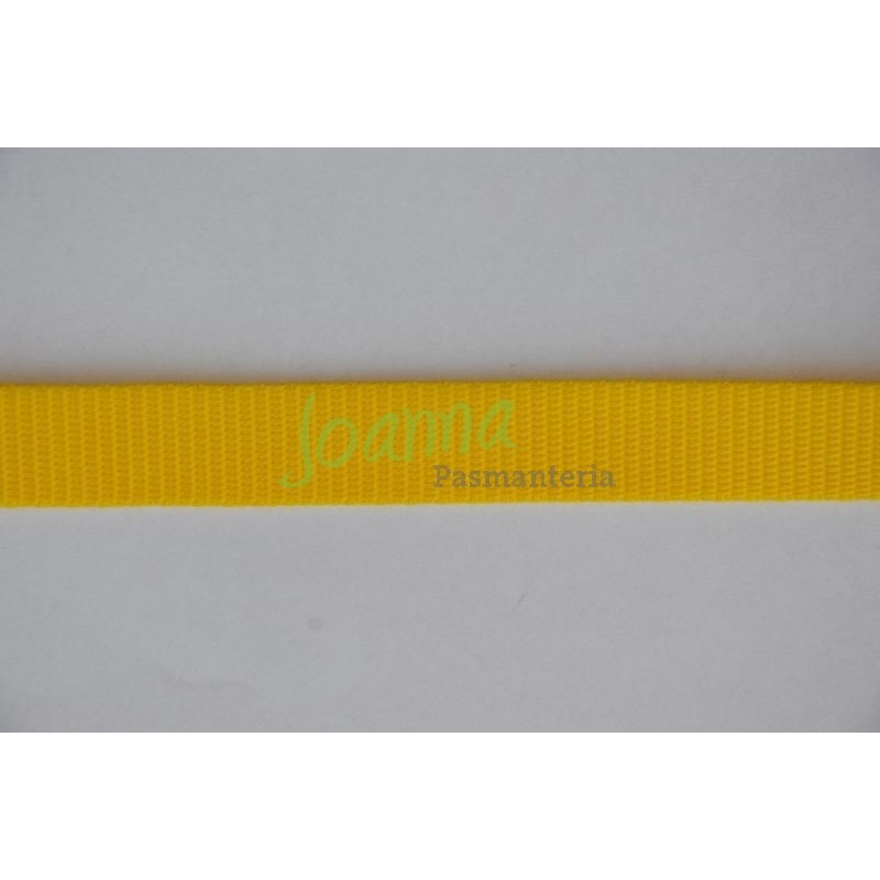 Taśma nośna - tapicerska. Szerokość 2cm. Kolor żółty. Jest to taśma tkana stosowana w produkcji plecaków, toreb, wykorzystywana jako taśma na ramię, bądź taśma na uchwyty.