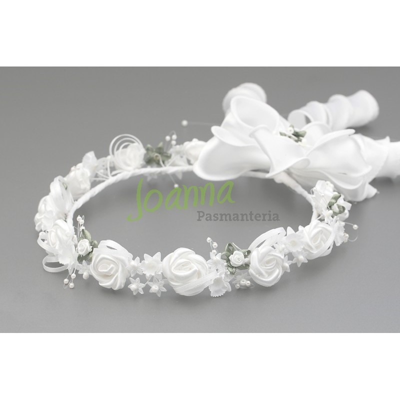 Białe różyczki przeplatane małym kwiatkiem z zielonym.