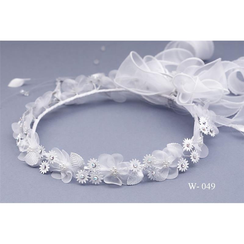 Wianek komunijny W-049. Kwiaty przeplatane drobnym kwiatkiem z cyrkonią. Z tyłu lokowana kokarda. Kolor biały . Wykonany z wysokiej jakości materiału. Produkt Poski. Rozmiar uniwersalny.