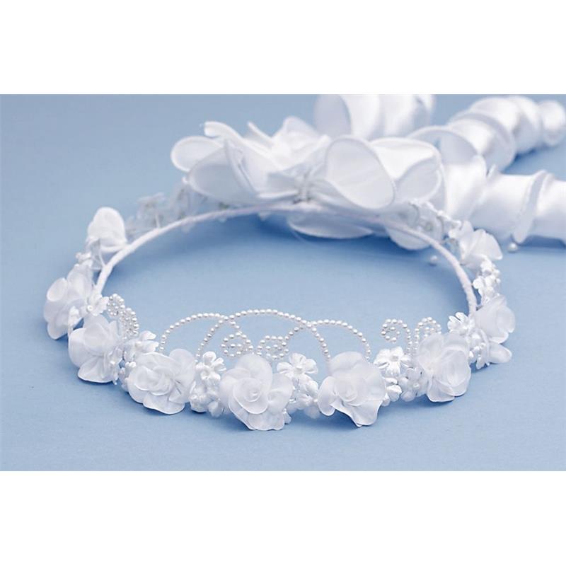 Wianek komunijny w-06. Białe kwiaty na przemian z drobnymi kwiatkami. Z przodu korona z perełek. Z tyłu kokarda atłasowa lokowana. Produkt Polski .Rozmiar uniwersalny.