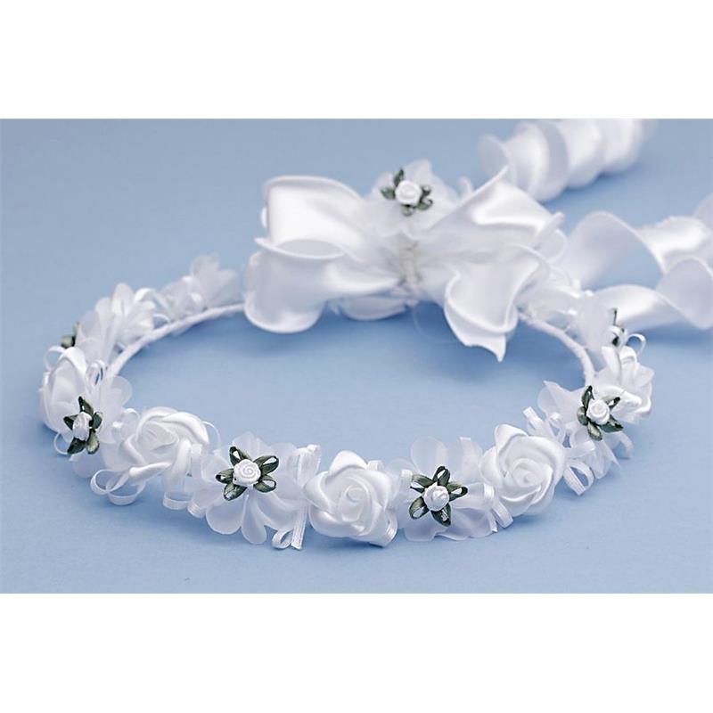 Wianek komunijny W-013. Różyczki przeplatane biało zielonymi kwiatami. Z tyłu lokowana kokarda. Kolor biały . Wykonany z wysokiej jakości materiału. Produkt Poski. Rozmiar uniwersalny.