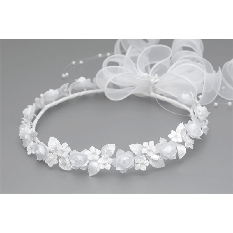 Wianek komunijny W-58. Białe kwiatki z małymi drobnymi. Z tyłu lokowana szyfonowa kokarda . Wykonany z wysokiej jakości materiału. Produkt Polski. Rozmiar uniwersalny.