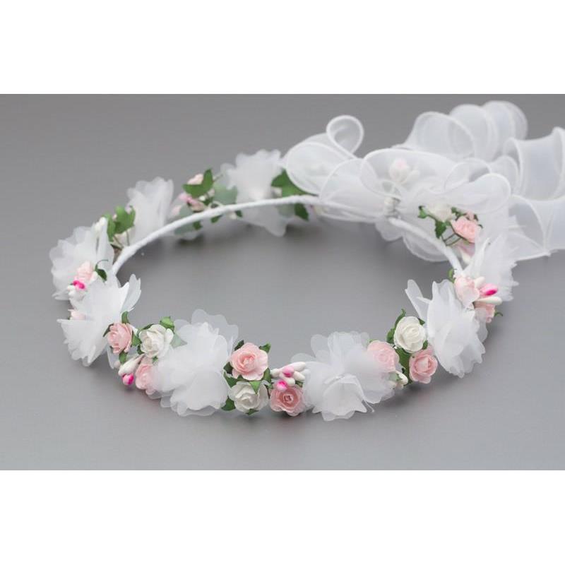 Wianek komunijny W-23. Skromne białe i różowe kwiatki skontrastowane z dużym kwiatkiem wykonanym z organdyny przełamanej szczyptą atłasu. Produkt Poski. Rozmiar uniwersalny.