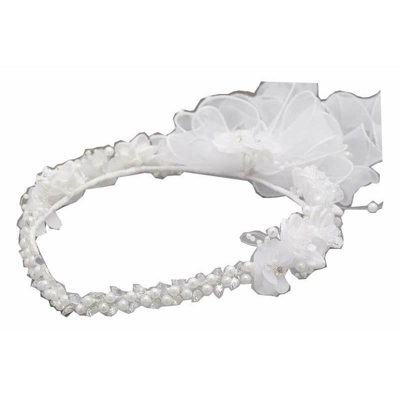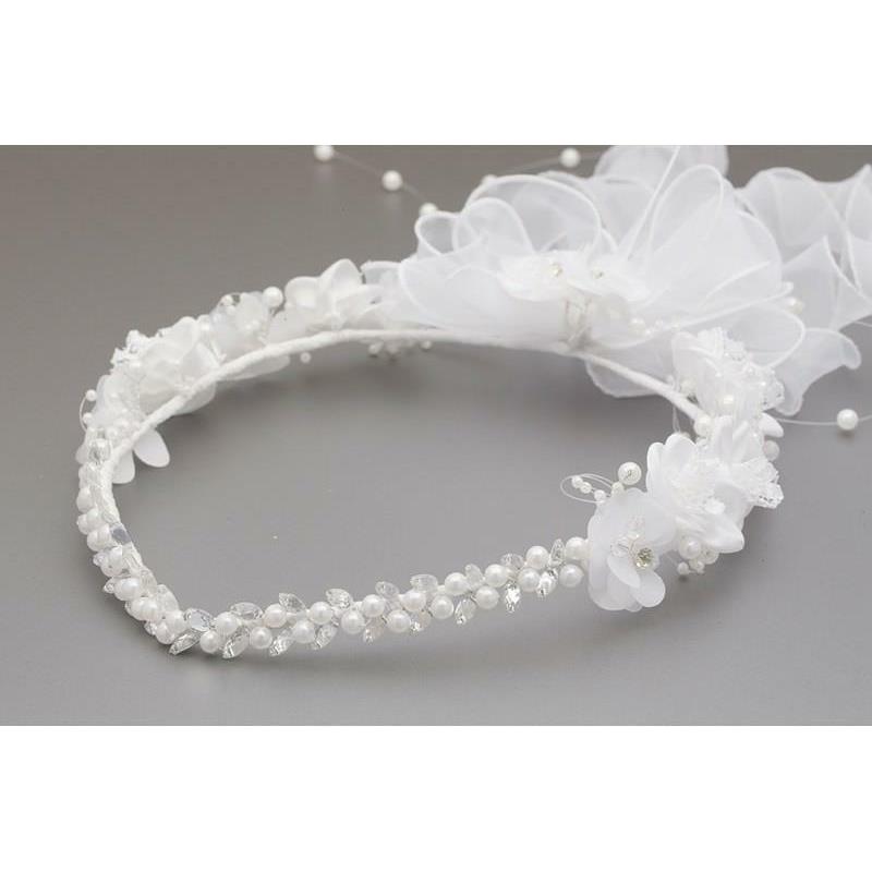 Delikatny wianek podkreślający czoło i przód z małych różyczek tył wzbogacony o ażurowe kwiatki i żyłkowe łuki z koralikami.