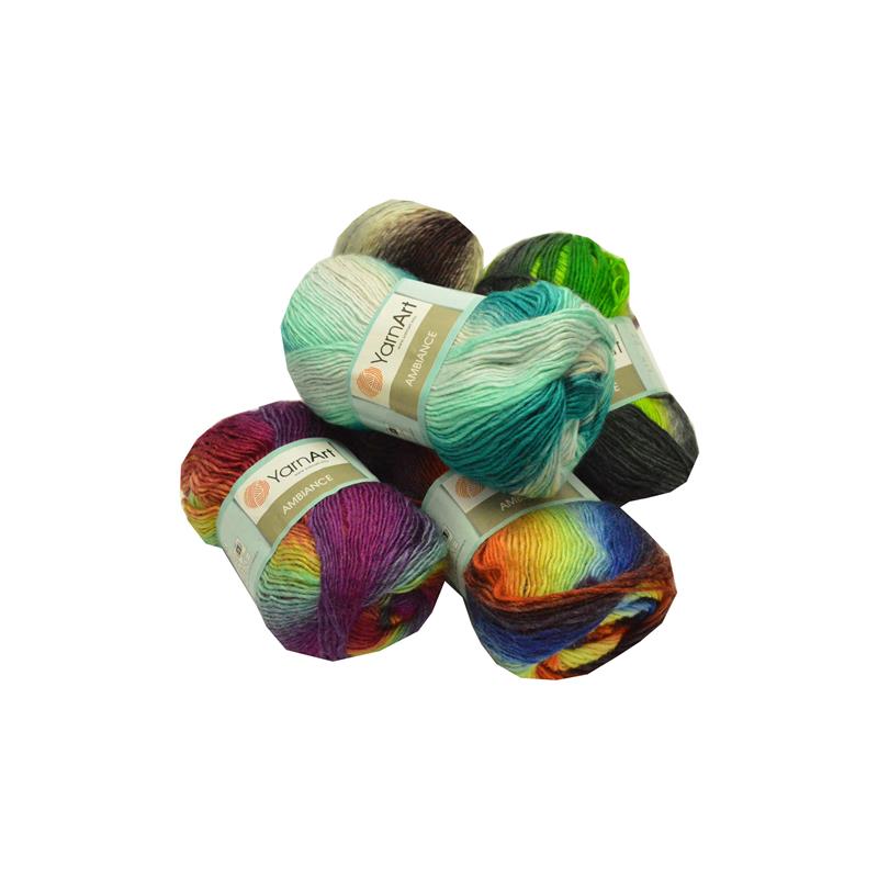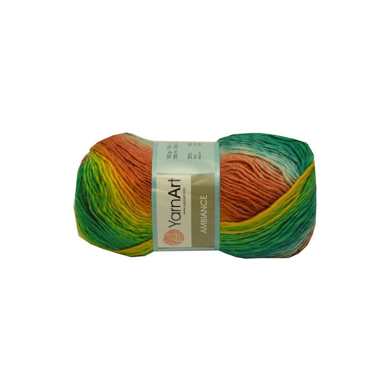 Włóczka Ambiance YarnArt Kolor 152 melanż zielonego, morskiego, pomarańczowego i żółtego. 100g/250m. Skład 20% Wool i 80% Akryl Zalecane druty 4mm, szydełko 4mm. Wiosenna melanżowa włóczka doskonale nadaje sie na chusty, bluzki, sikienki. Cena za 1 motek.