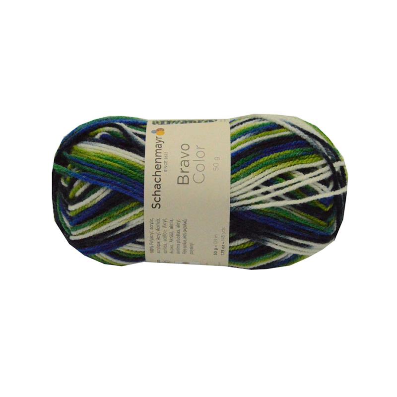 Włóczka Bravo Color. Kolor 02130 biały, zielony, niebieski, granat Motek 50 g/133 m Skład 100% akryl Zalecane szydełko i druty: 3-4 mm Akrylowa włóczka średniej grubości w efektownych połączeniach kolorystycznych. Całoroczna, wszechstronne zastosowanie, łatwa w pielęgnacji, niegryząca. Świetny efekt daje w połączeniu z jednokolorową wersją. Cena za 1 motek