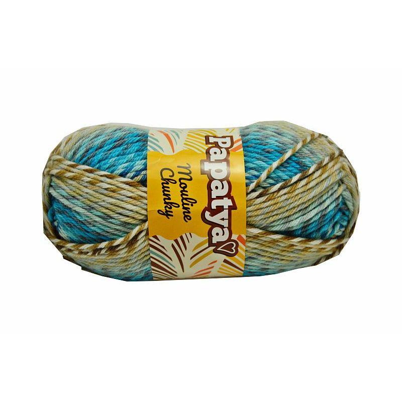 Włóczka PAPATYA Mouline Chunky . Kolor turkusowy, brąz i beż 100g/160m skład:100% akryl. zalecane szydełka 5,5mm. zalecane druty6-7mm Miękka, wielobarwna włóczka świetnie nadaje się na czapki, kominy, szaliki i swetry. Cena za 1motek.