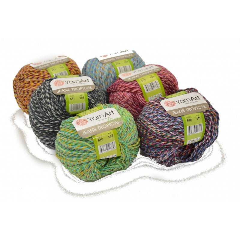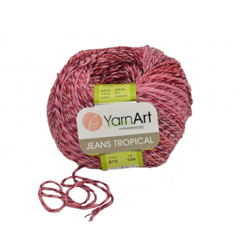 Włóczka Jeans Tropical Yarn Art Kolor 616 melanż róż, bordo Kraj pochodzenia: Turcja Skład: 55% bawełna 45% poliakryl 1 Motek: 50 gr, Długość: 160 m Druty: 3,5 mm Szydełka: 3,5 mm Producent YarnArt Posiada ten sam skład i długość co klasyczna włóczka Jeans. Można swobodnie te dwie włóczki łączyć ze sobą w wyrobie. Włóczka Jeans Tropical wyróżnia się wielobarwną nitką. Cena za 1 motek.