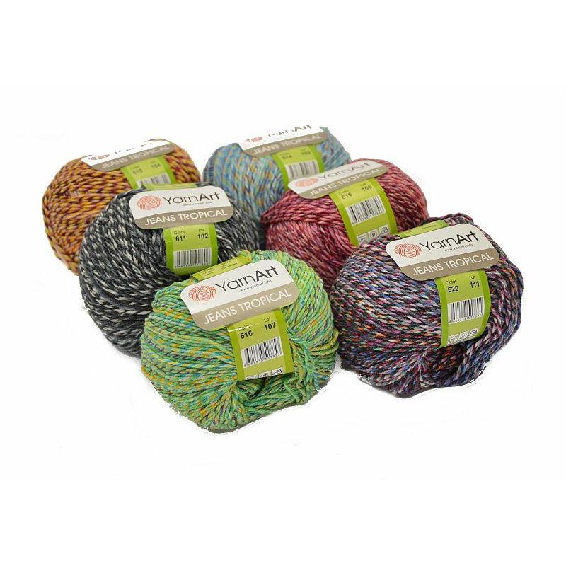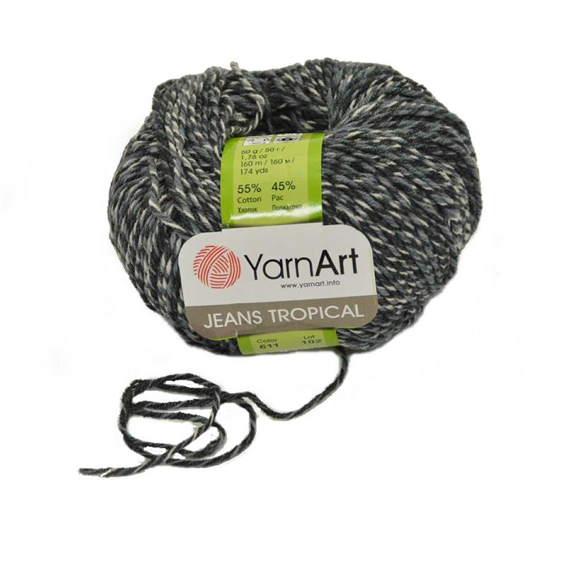 Włóczka Jeans Tropical Yarn Art Kolor 611 melanż czarny, szary, biały. Kraj pochodzenia: Turcja Skład: 55% bawełna 45% poliakryl 1 Motek: 50 gr, Długość: 160 m Druty: 3,5 mm Szydełka: 3,5 mm Producent YarnArt Posiada ten sam skład i długość co klasyczna włóczka Jeans. Można swobodnie te dwie włóczki łączyć ze sobą w wyrobie. Włóczka Jeans Tropical wyróżnia się wielobarwną nitką. Cena za 1 motek.