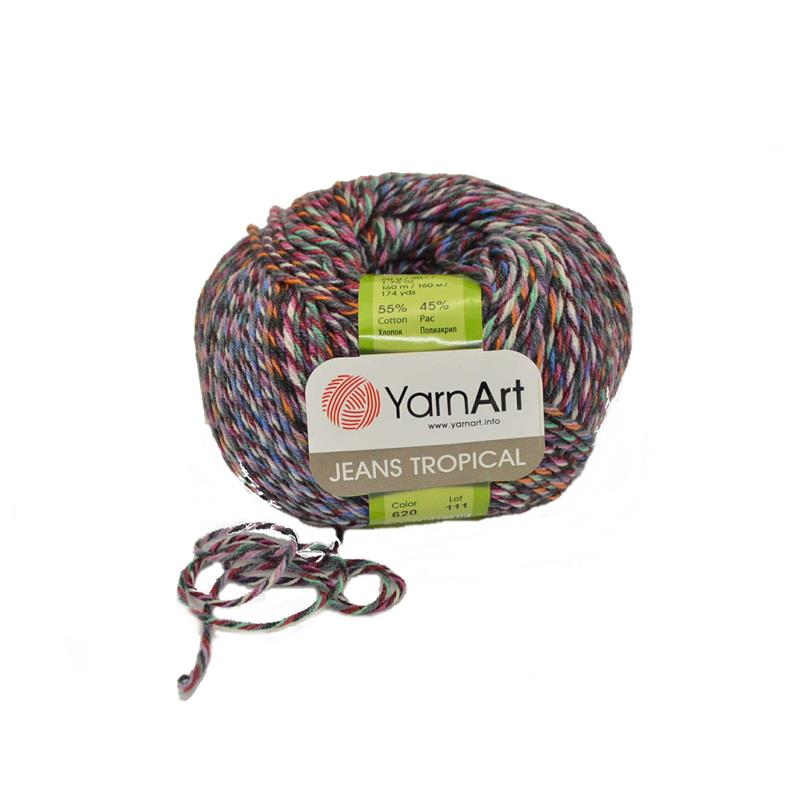 Włóczka Jeans Tropical Yarn Art Kolor 620 melanż fiolet, róż, turkus, pomarańcz. Kraj pochodzenia: Turcja Skład: 55% bawełna 45% poliakryl 1 Motek: 50 gr, Długość: 160 m Druty: 3,5 mm Szydełka: 3,5 mm Producent YarnArt Posiada ten sam skład i długość co klasyczna włóczka Jeans. Można swobodnie te dwie włóczki łączyć ze sobą w wyrobie. Włóczka Jeans Tropical wyróżnia się wielobarwną nitką. Cena za 1 motek.