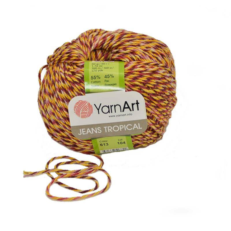 Włóczka Jeans Tropical Yarn Art Kolor 613 melanż żółty, róż, bordo Kraj pochodzenia: Turcja Skład: 55% bawełna 45% poliakryl 1 Motek: 50 gr, Długość: 160 m Druty: 3,5 mm Szydełka: 3,5 mm Producent YarnArt Posiada ten sam skład i długość co klasyczna włóczka Jeans. Można swobodnie te dwie włóczki łączyć ze sobą w wyrobie. Włóczka Jeans Tropical wyróżnia się wielobarwną nitką. Cena za 1 motek.
