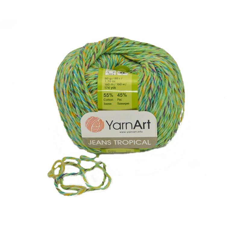 Włóczka Jeans Tropical Yarn Art Kolor 616 melanż zielony, żółty, turkus. Kraj pochodzenia: Turcja Skład: 55% bawełna 45% poliakryl 1 Motek: 50 gr, Długość: 160 m Druty: 3,5 mm Szydełka: 3,5 mm Producent YarnArt Posiada ten sam skład i długość co klasyczna włóczka Jeans. Można swobodnie te dwie włóczki łączyć ze sobą w wyrobie. Włóczka Jeans Tropical wyróżnia się wielobarwną nitką. Cena za 1 motek.