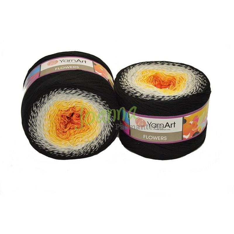 Włóczka FLOWERS YarnArt. Kolor czarny, szary, biały, żółty, pomarańczowy. Motek: 250 gram /1000mb. Mieszanka poliakrylu 45% i bawełny 55%. Ładne zestawienia kolorystyczne, które pięknie łączą się w gotowym wyrobie. Z jednego motka możemy zrobić piękną chustę. Zalecane druty: 2,5 mm. Zalecane szydełka: 3,5 mm