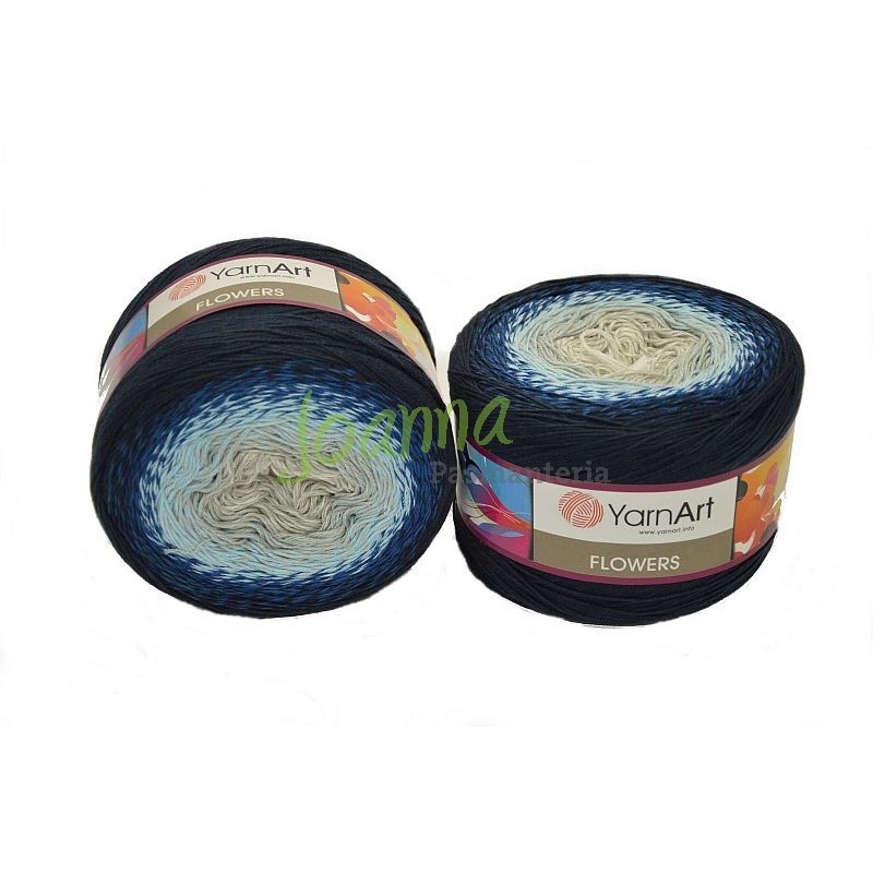 Włóczka FLOWERS YarnArt. Kolor 261 granat, niebieski, błękit, szary. Motek: 250 gram /1000mb. Mieszanka poliakrylu 45% i bawełny 55%. Ładne zestawienia kolorystyczne, które pięknie łączą się w gotowym wyrobie. Z jednego motka możemy zrobić piękną chustę. Zalecane druty: 2,5 mm. Zalecane szydełka: 3,5 mm
