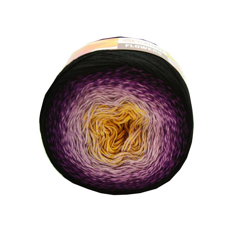 Włóczka FLOWERS YarnArt. Kolor 303 odcienie czarnego, fioletu i miodowego. Motek: 250 gram /1000mb. Mieszanka poliakrylu 45% i bawełny 55%. Ładne zestawienia kolorystyczne, które pięknie łączą się w gotowym wyrobie. Z jednego motka możemy zrobić piękną chustę. Zalecane druty: 2,5 mm. Zalecane szydełka: 3,5 mm Cena za 1 motek.